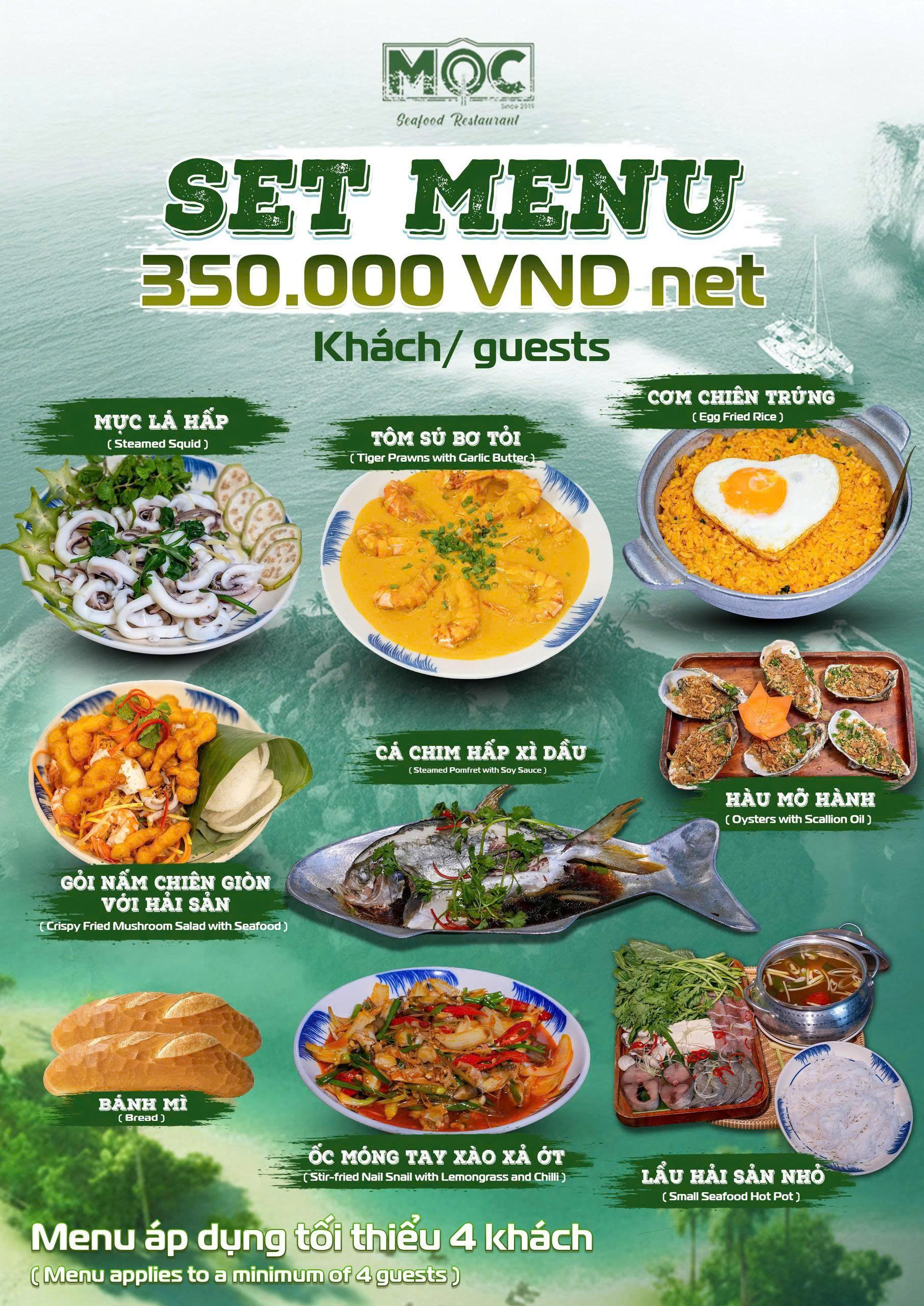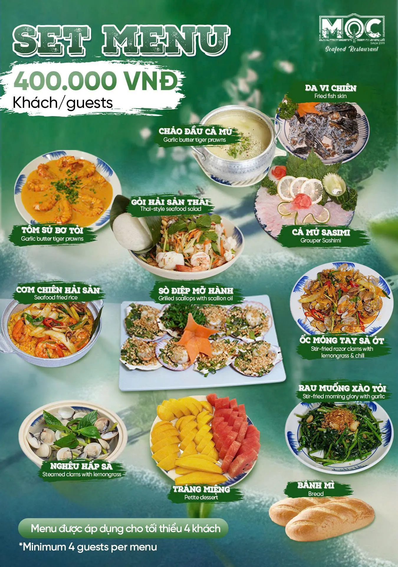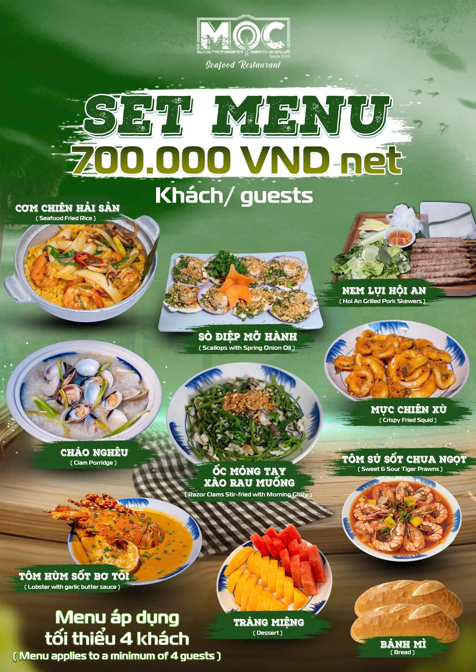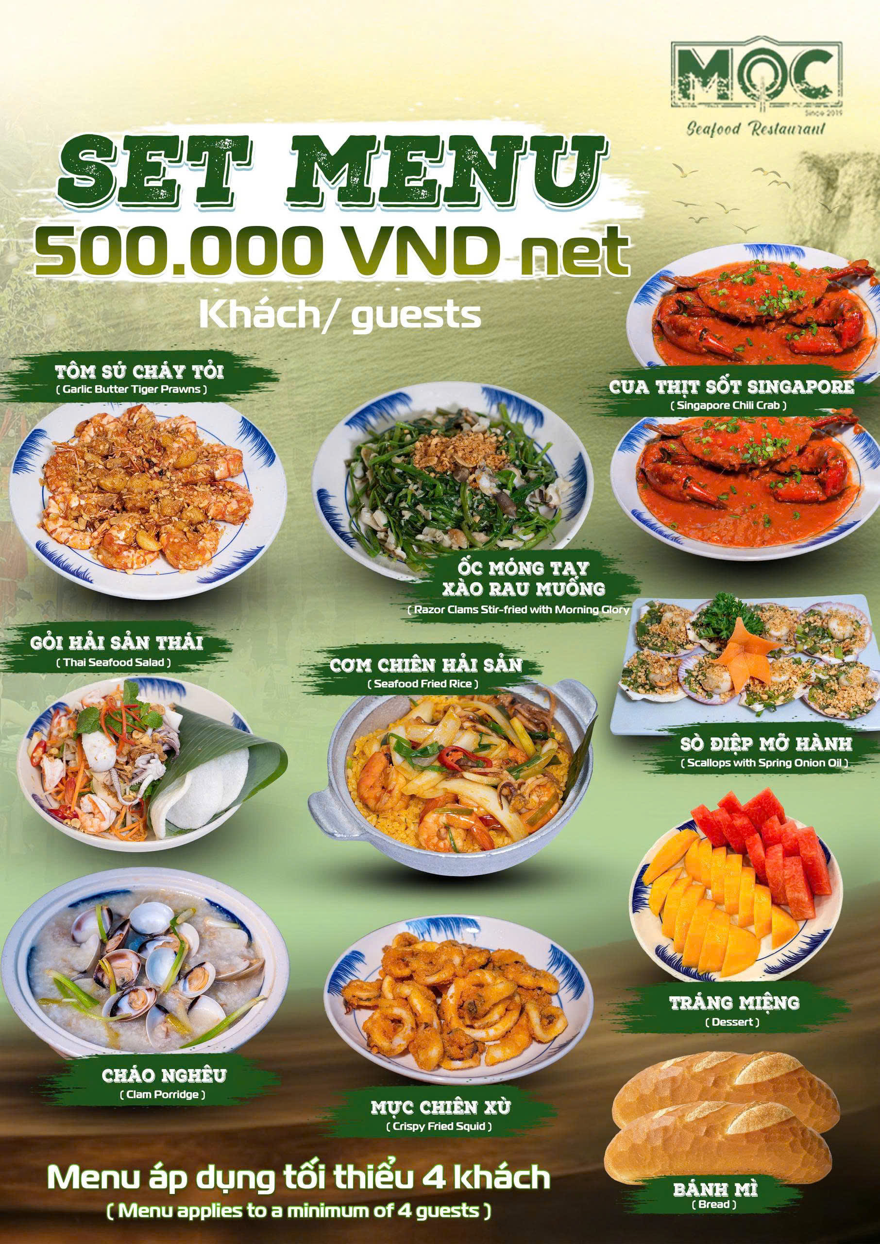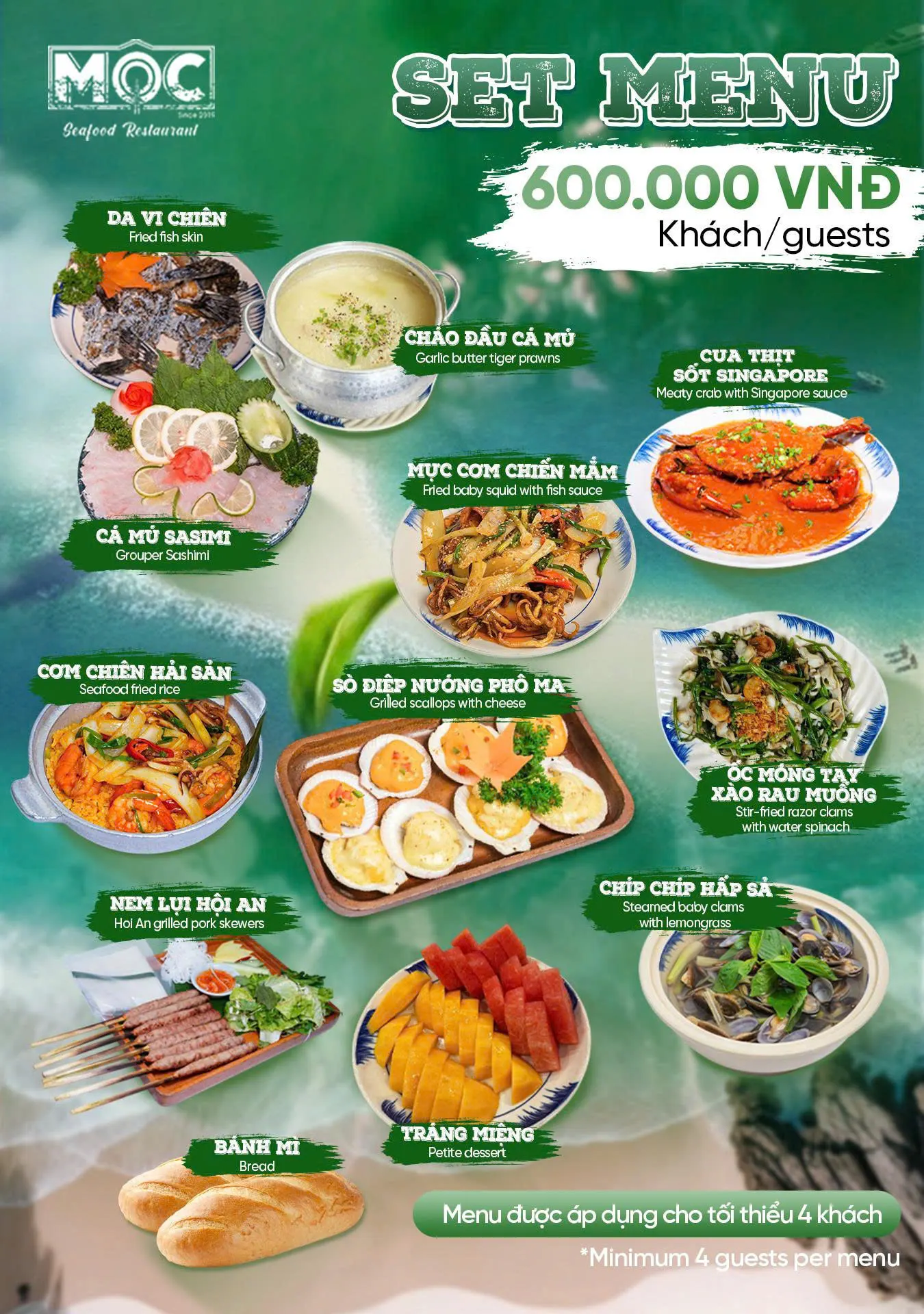 Combo/Set Menu tại Nhà hàng Hải sản Mộc Quán được xây dựng theo phong cách trang trọng nhưng gần gũi, mang đến trải nghiệm ẩm thực chỉn chu mà vẫn ấm cúng, thân thiện. Mỗi set là sự chọn lọc hài hòa giữa hải sản tươi sống trong ngày và các món ăn đặc trưng đậm đà hương vị biển Việt, được chế biến cẩn trọng nhằm giữ trọn độ tươi ngon và giá trị ẩm thực. Phù hợp cho những buổi sum họp gia đình, gặp gỡ đối tác hay tiếp đãi bạn bè, combo tại Mộc Quán giúp thực khách dễ dàng lựa chọn, thưởng thức bữa ăn trọn vẹn trong không gian mộc mạc, tinh tế và đầy tính kết nối.
